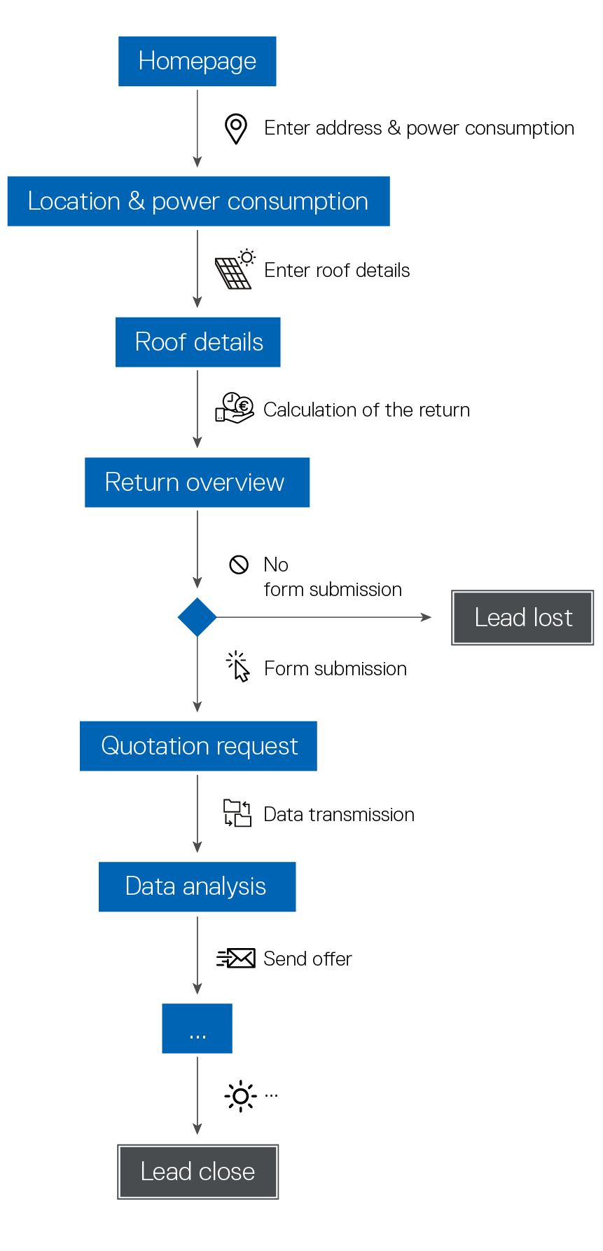 EIGENSONNE has created different State Machines. Here’s an illustration of their sales process, divided into 12 steps. The team divided the rather complex process of preparing the offer and closing the sale into five different process categories and packed these into logical, successive steps. New or updated process elements can be integrated within a few hours or a couple of days at most. The visualization is so user-friendly that every stakeholder in the business can understand everything without having to get involved in the technical aspects.